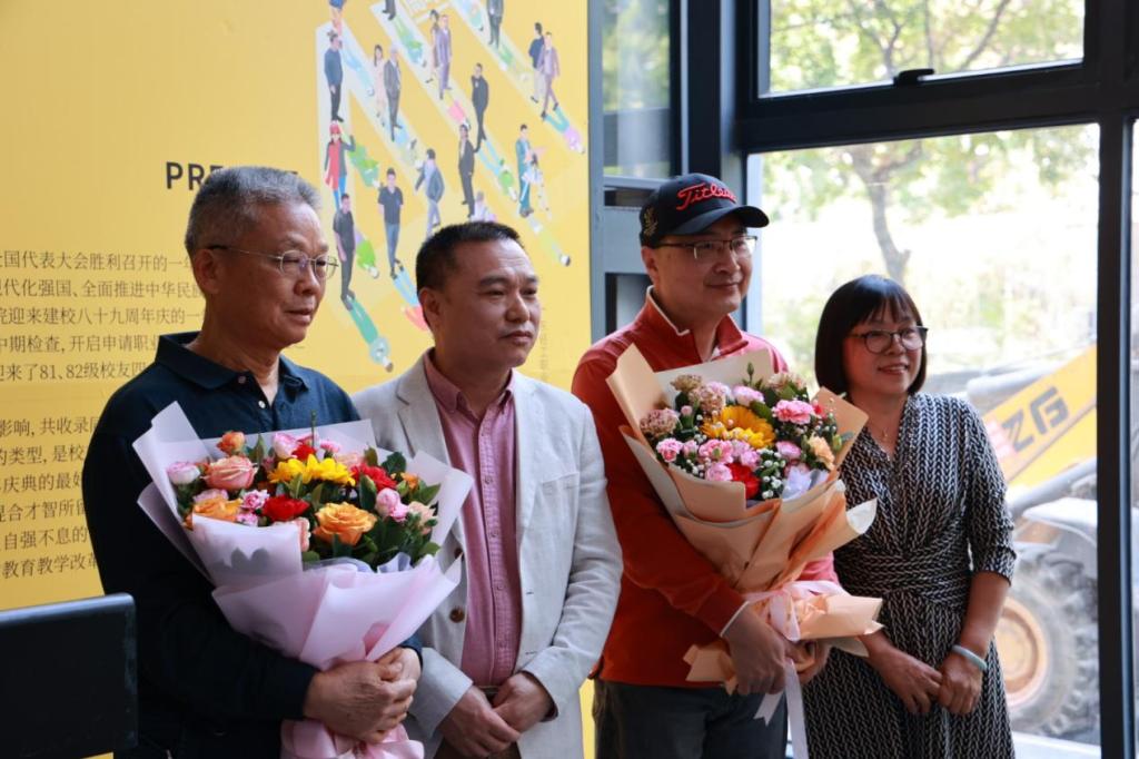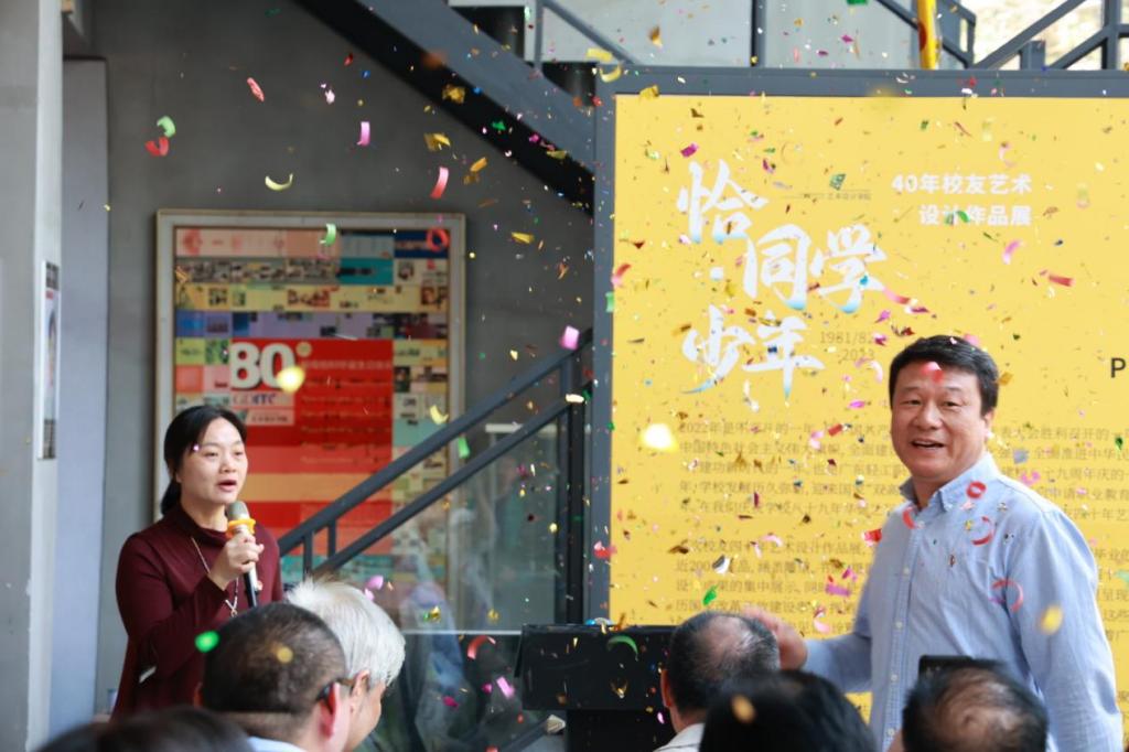 老教师代表致辞。林旭老师表示:“走进展厅感到特别骄傲,因为看到自己教出这么多有出息的学生,心里特别开心和自豪。” 余希洋老师表示:“你们保持积极的人生态度,几十年如一日坚持从事着设计与艺术相关的工作,并带着众多优秀的作品回母校,说明母校多年的教育是很成功的,母校为你们骄傲,母校感谢你们。”