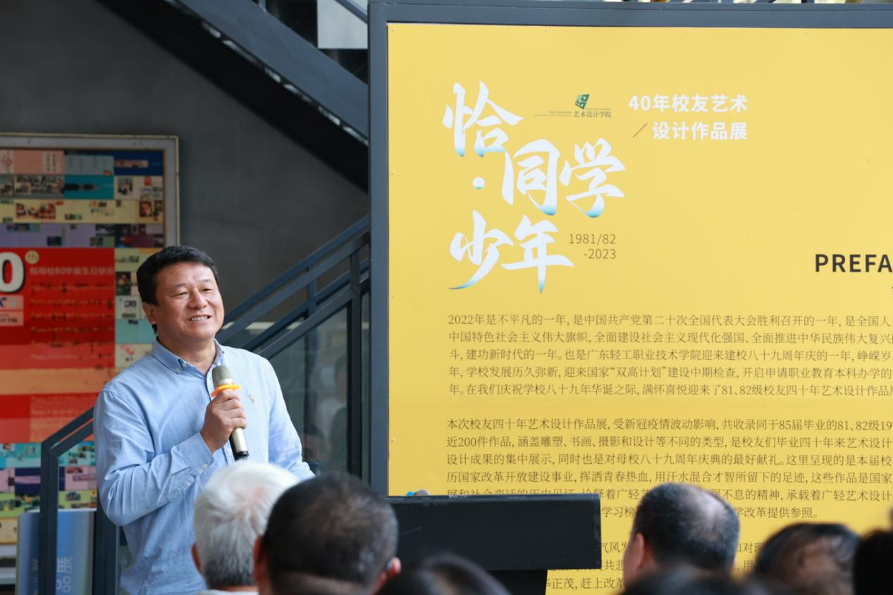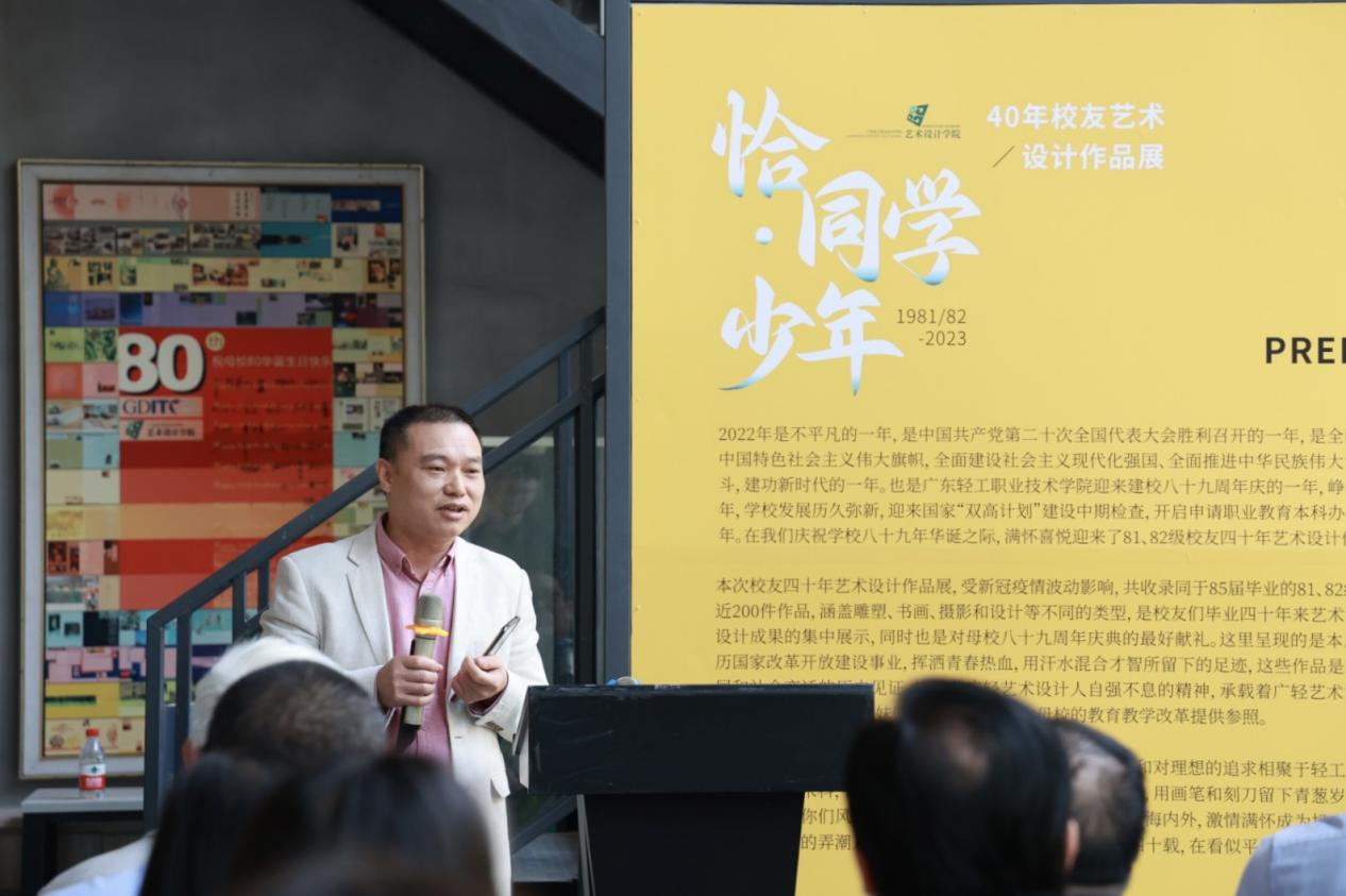 桂元龙院长上台为开幕式致辞。他在致辞中表示:81、82级的校友大多出生在60年代,是有理想、有抱负,愿意奉献的一代人。毕业的时候,他们刚好赶上改革开放,40多年以来,他们是改革开放的见证者和贡献者。今天,他们带着代表性的成果回到母校参加展览,意义非凡。这些作品是国家高速发展和社会变迁的“历史见证者”,诠释着广轻艺术设计人自强不息的精神,承载着广轻艺术设计的文脉传承,给学弟学妹们留下学习榜样,为母校的教育教学改革提供参照。对校友的回校,他表示热烈的欢迎和祝贺!