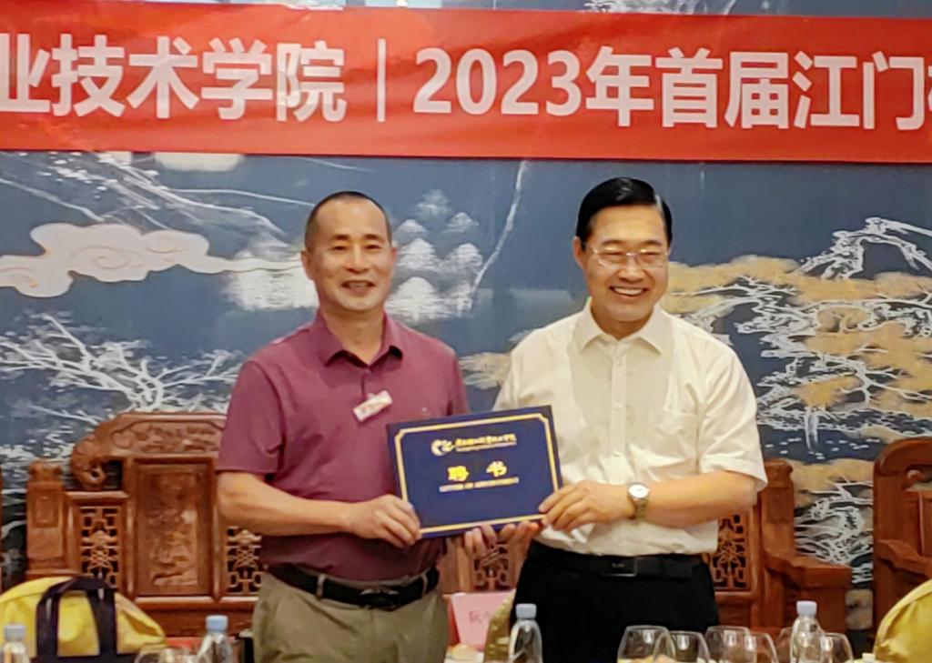 卢校长现场为李英明会长颁发广东省广东轻工职业技术学院校友会理事聘书。