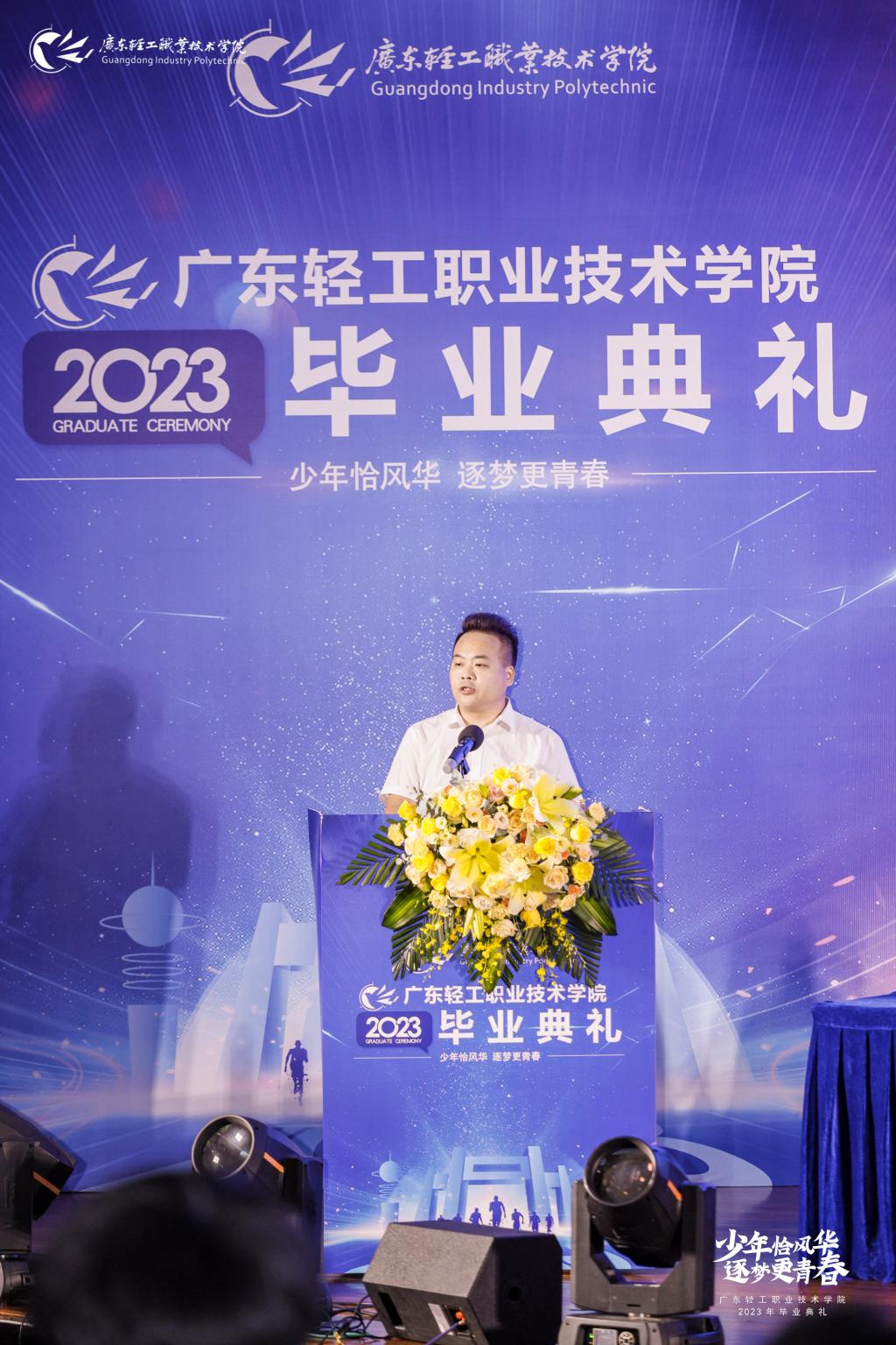 张高峰在毕业典礼的讲话中表达出对广轻的无限感激之情,他提到,在工作、创业的道路上,离不开广轻,这张名片给予的平台资源,离不开广轻各位老师的悉心帮助和指导;并给予师弟师妹提出“四个勤字”的要求和忠告:勤于学习、勤于观察、勤于思考、勤于实践。学习是永无止境的,亲身实践是必不可少的,大家要大胆去面对未来的人生,储备知识,储备能量,储备经验,从小事做起,从最基层做起,循序渐进,把握机会,一定会取得成功的。