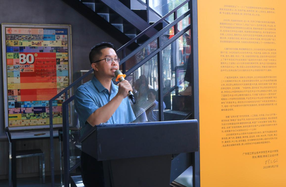 开幕式上,学院党委书记李宽松对校友重返校园,表示最热烈的欢迎,对校友毕业二十年后在母校举办作品展表示最诚挚的祝贺。他表示,今年是特殊的一年,是全面贯彻党的二十大精神的开局之年,是我校建校九十周年,也是“双高”建设验收之年,更是全校上下齐心协力申办本科之年;各位校友在各自的岗位上建功立业,不仅仅成绩斐然,而且实现了人生梦想,诠释着广轻艺术设计人的初心,以实际行动演绎着“德能兼备、学以成之”的校训,用青春和智慧书写了生命的华丽乐章。希望各位校友关心和支持母校的发展,携手推动母校继续铸造辉煌!