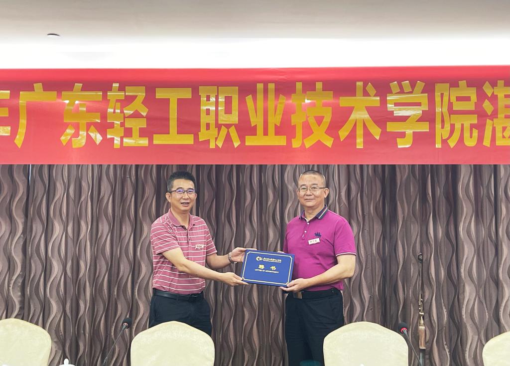 邓毛程为林江成会长颁发广东省广东轻工职业技术学院校友会理事聘书。