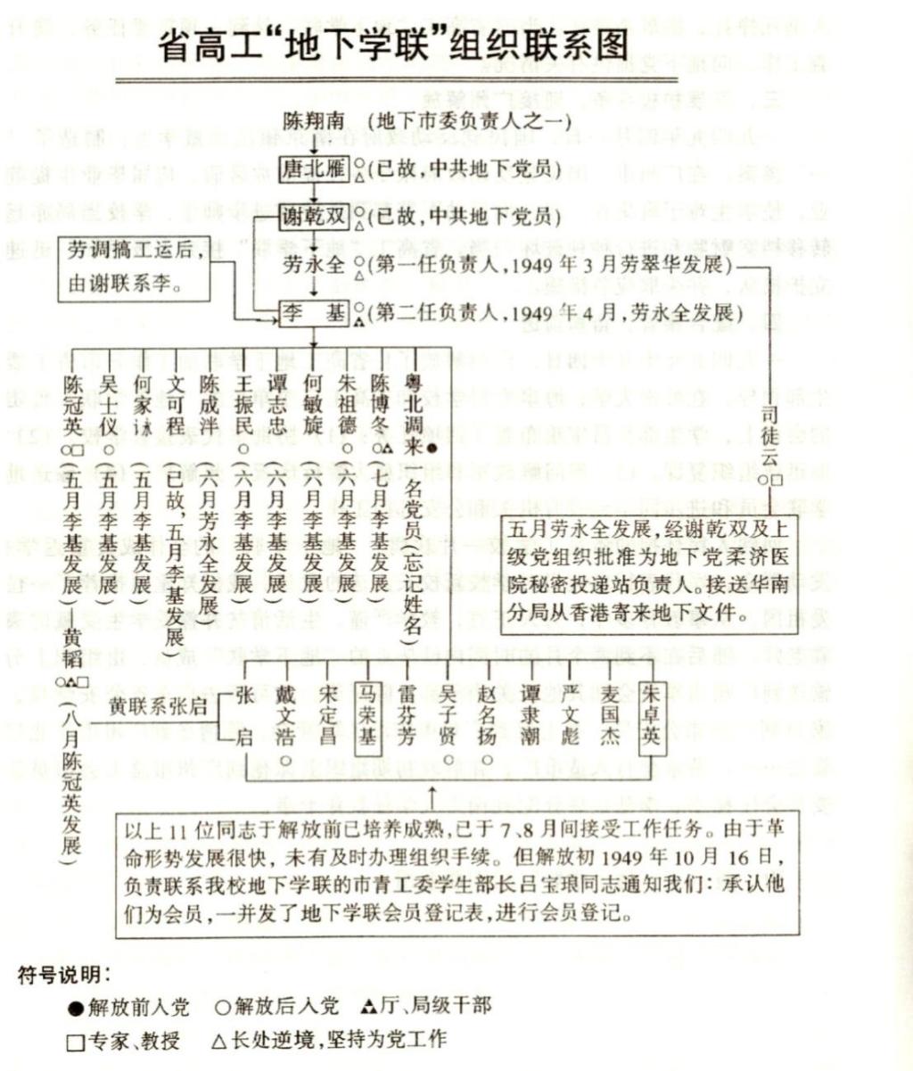 此外,解放前有一批已培养得比较成熟准备发展的同学(他们实际上已为地下学联工作,只因革命形势发展很快,组织上来不及发展广州就解放了)对这些同学,根据组织上的指示,承认其为地下学联会员,填写了“广州地下学联”会员登记表。据回忆有马蔡基、雷芬芳、吴子贤、赵名扬、张启、谭隶潮、严文彪、麦国杰、朱卓英等。还有一位在粤北工作的地下党员,因身份暴露,奉组织的指示转入省高工进行隐蔽,编入地下学联。总之,省高工地下学联会员共25人,名单只有李基和上级组织掌握,互相之间谁是地下学联会员是不知道的。