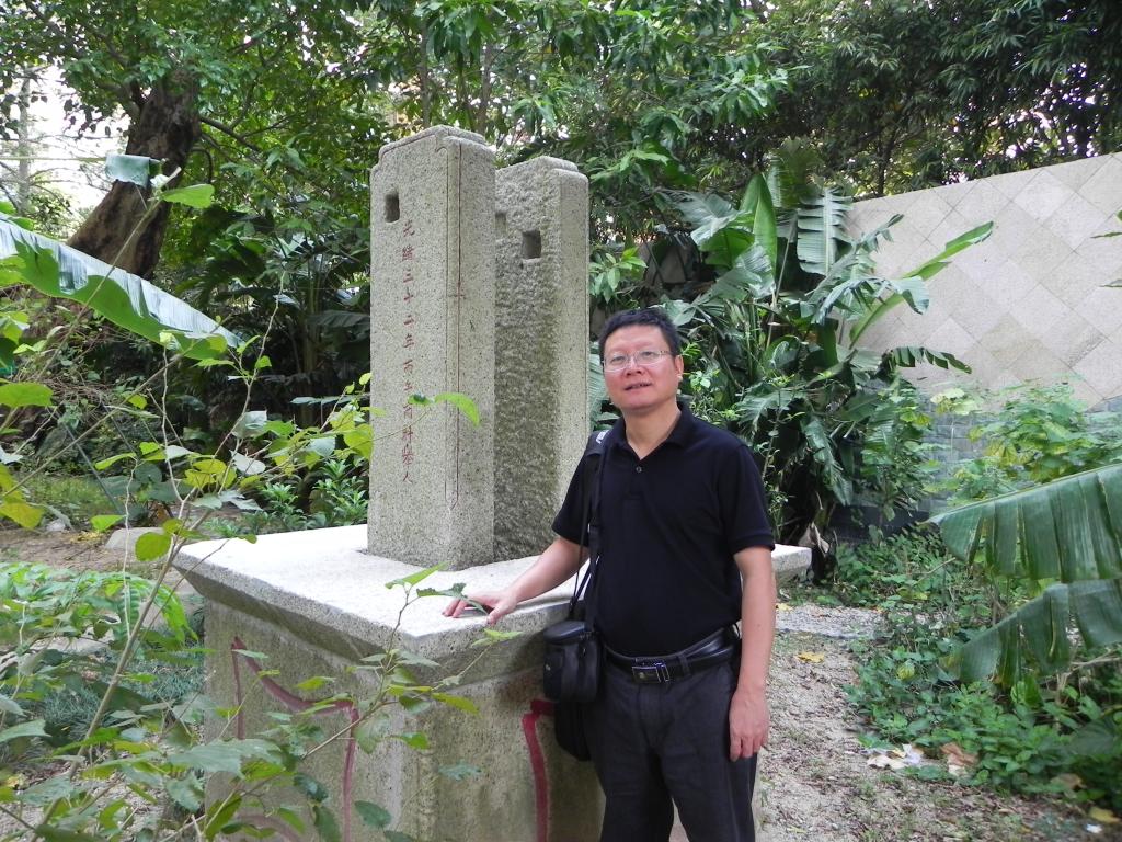 我一看,脑海中立刻将回忆录上老照片上与这里的遗迹进行对照,哈,在老榕树下,有两组旗杆石敦,还真像老照片中的样子,但亦有与原来照片不同的就是周围的背景已有很大的变化。这就是清朝时这里曾有人中举,为光宗耀祖,曾立下旗杆,是两块花岗岩做的墩,上面刻有字,以作记载。而回忆录中老校友有记录,包括石鼓、旗杆石墩等,于是我让揭广川将这两组鼓吹举人名誉痕迹的旗杆石照下。因为要赶时间,无暇仔细端详,赶紧去探访那位老人。