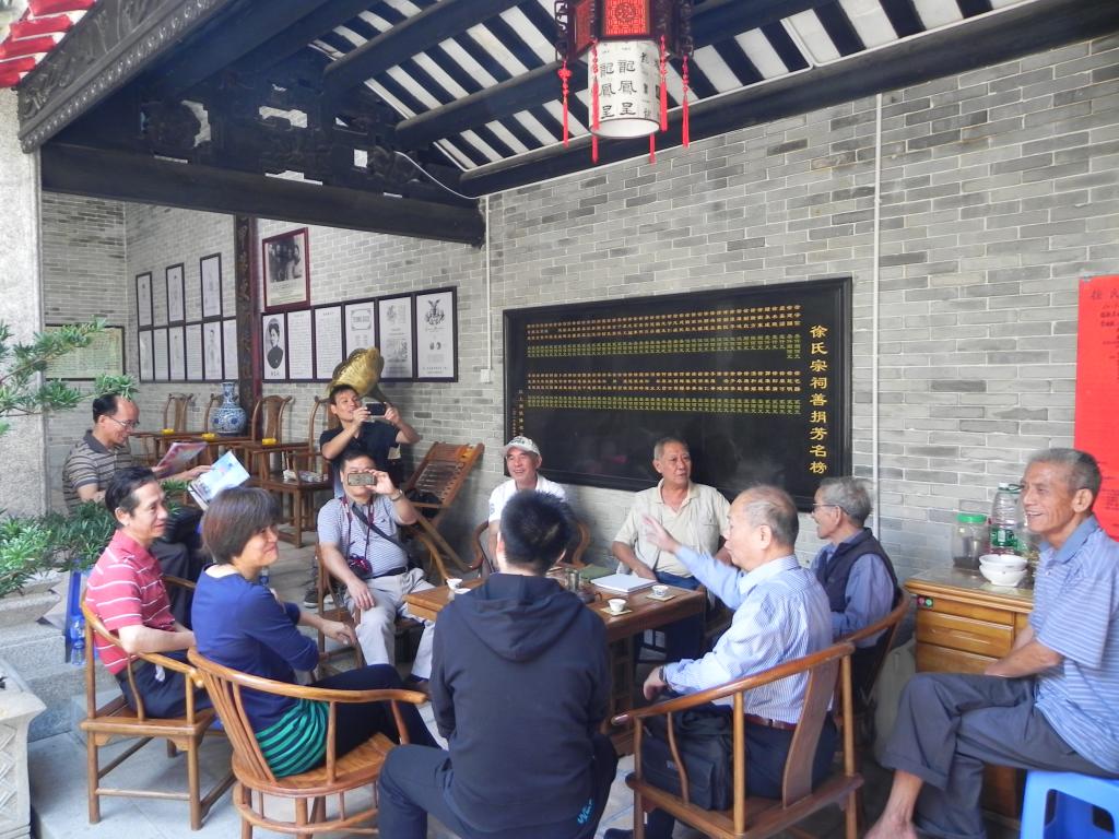我们边聊边记录,只是考虑下午还要去参与韶关校友会的活动,不得不在靠近中午时终止了这个非常特别的采访。经劳荣均老师的提醒,我们为了感谢徐志剑老人,说没有带什么手信来给当年收留我校的恩人,我们是知恩图报的,只好日后再来报答。随手送了二百元给老人饮茶,但徐志剑老人死活不收。徐康池老人最后说服了他。我们感到很高兴,最后在祠堂门口拍了一张合照,留下了珍贵的一刻。