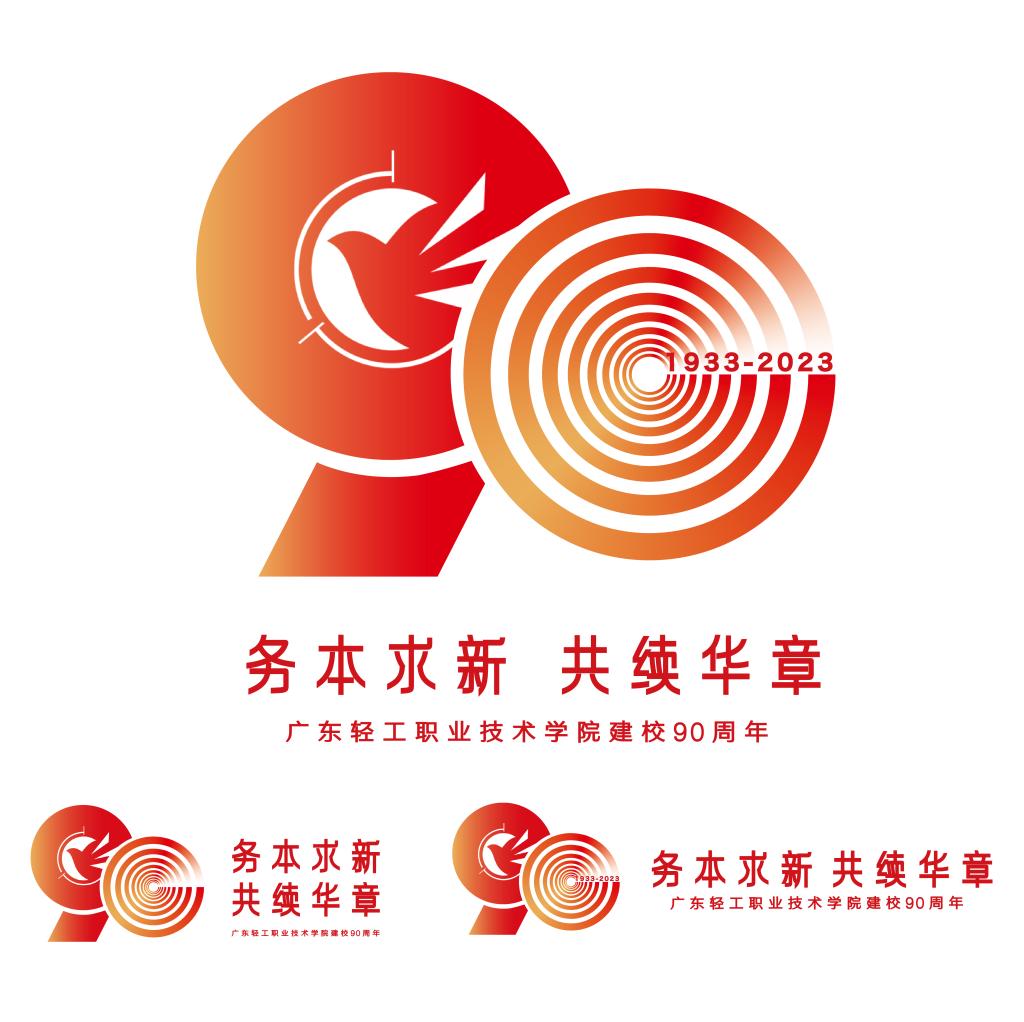 2、左半边图形将数字“9”与“校徽”结合,延续“校徽”的核心理念,体现九十年来广东轻工职业技术学院坚持以培养高素质技术技能人才为办学定位,不忘初心,务本求新;“飞鸟”形象象征学校与莘莘学子展翅翱翔、共续华章的美好前景。