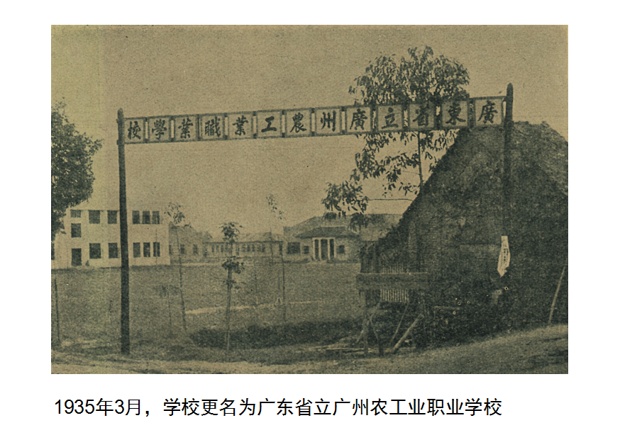 1935年3月,广东省立第一职业学校更名为“广东省立广州农工业职业学校”,简称“省广职”。