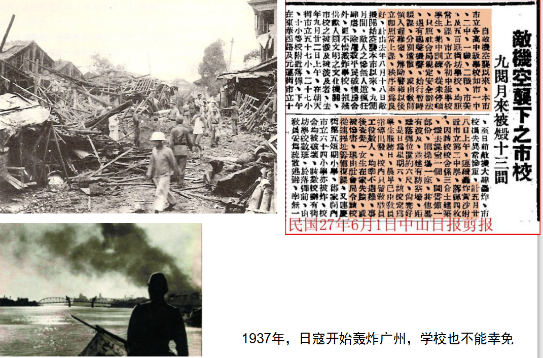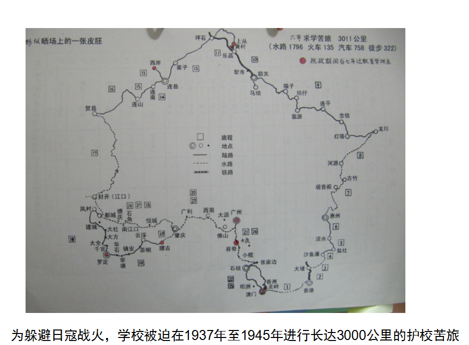 1937年9月,日寇开始袭击广州,为躲避日寇战火,学校被迫在1937年至1945年进行长达3000公里的护校苦旅。