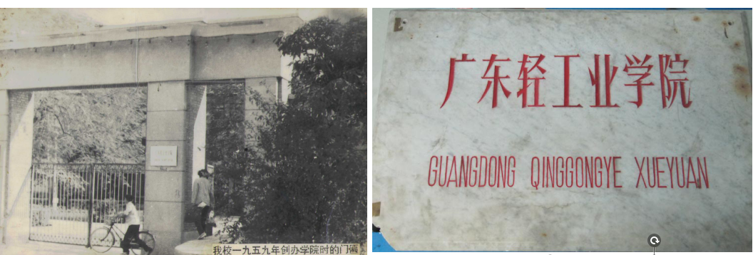 1959年10月,轻工业部广州糖酒工业学校、轻工业部属广州造纸工业学校、轻工业部属南宁造纸工业学校合并组建“广东省轻工业学校”。后升格创办“广东轻工业学院”,分设大学部和中专部。